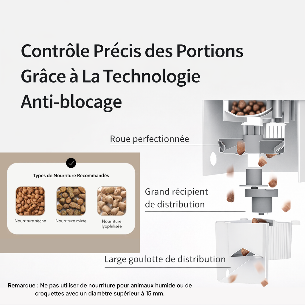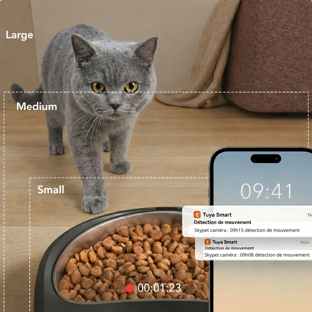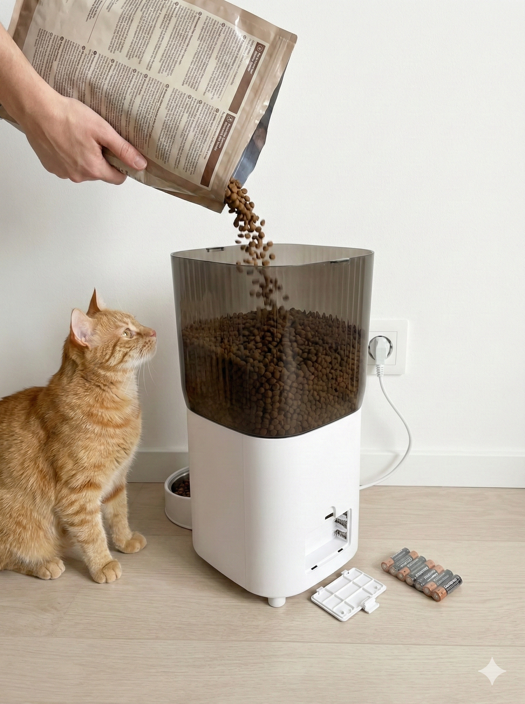 Remplissez le réservoir de croquettes, branchez l’appareil (ou insérez les piles de secours) et placez-le à l’endroit idéal.